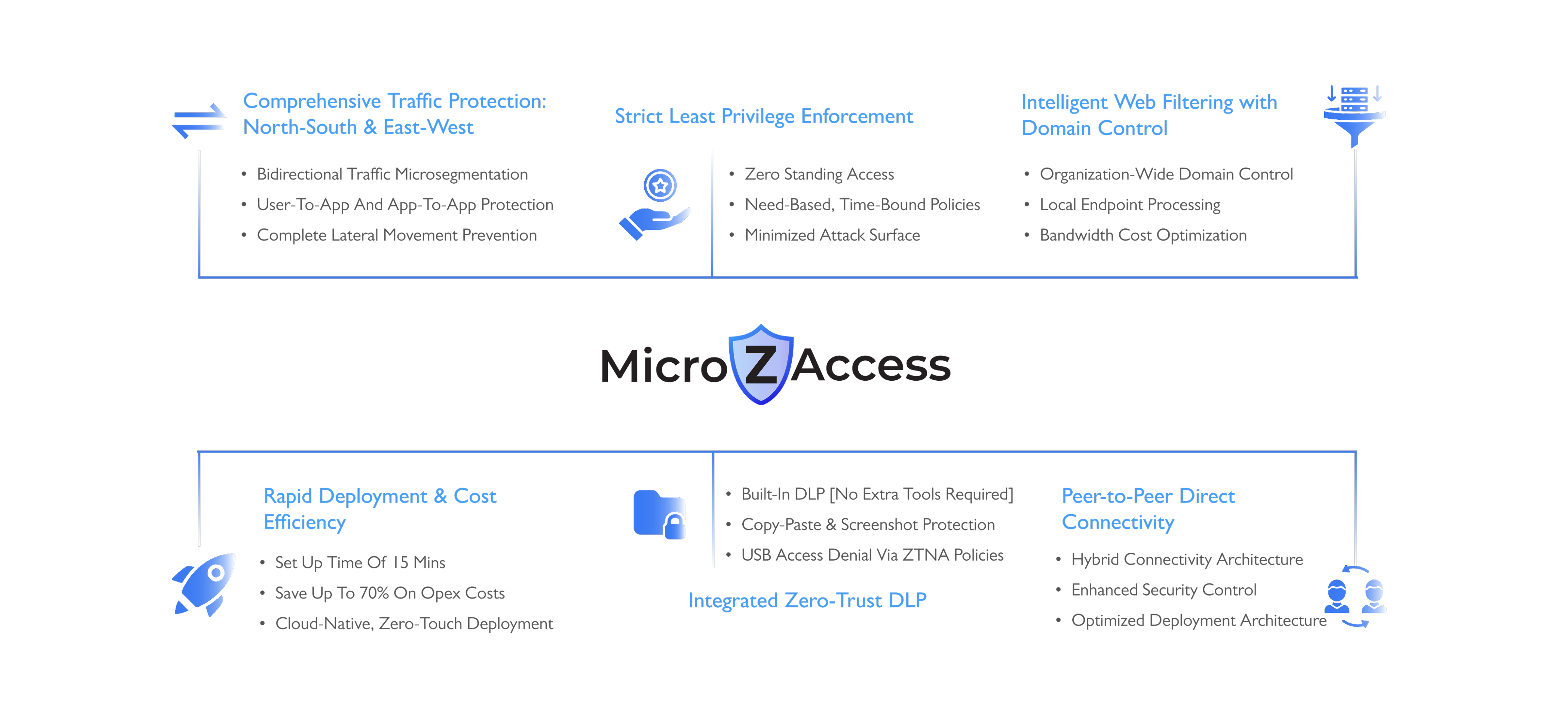 Apps stay invisible by default. MicroZAccess inspects traffic, filters risks, and continuously monitors for threats preventing lateral movement.